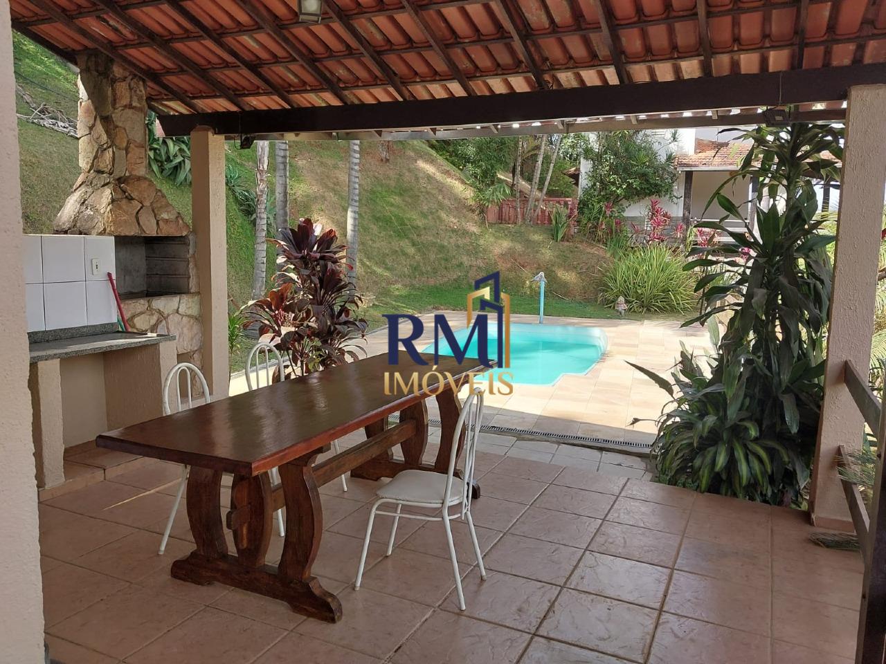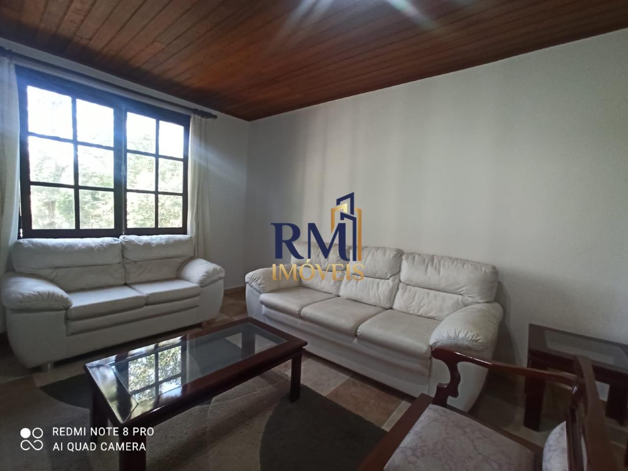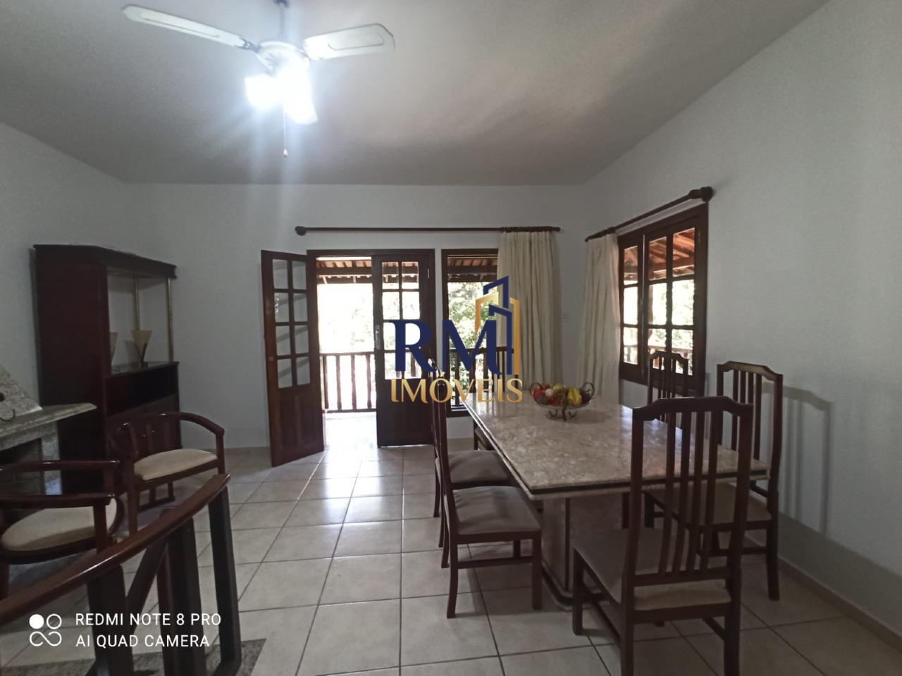 A sala de jantar tem lareira. Uma ótima varanda, com vista incrível de verde da natureza.