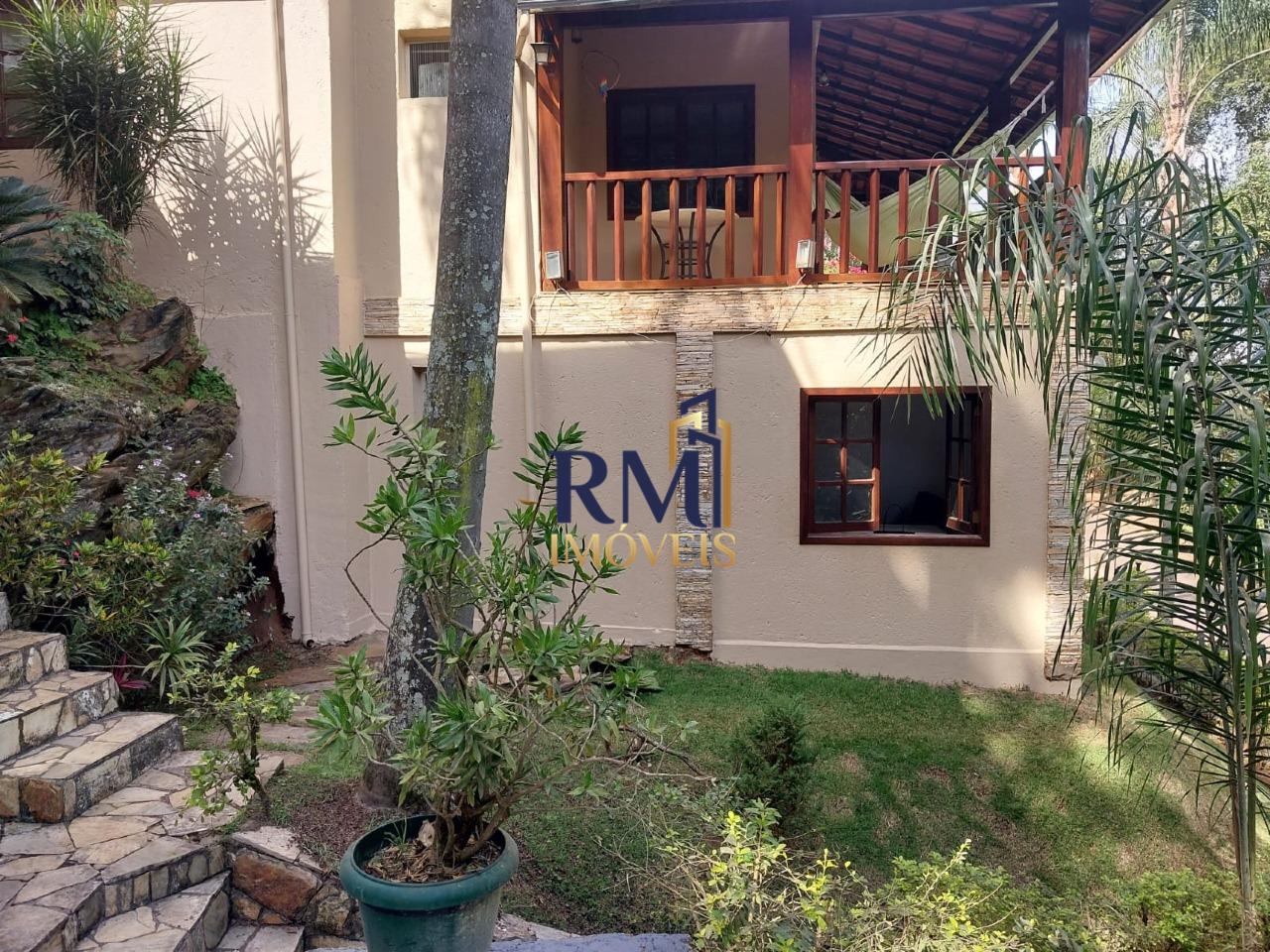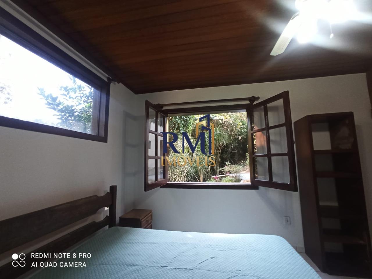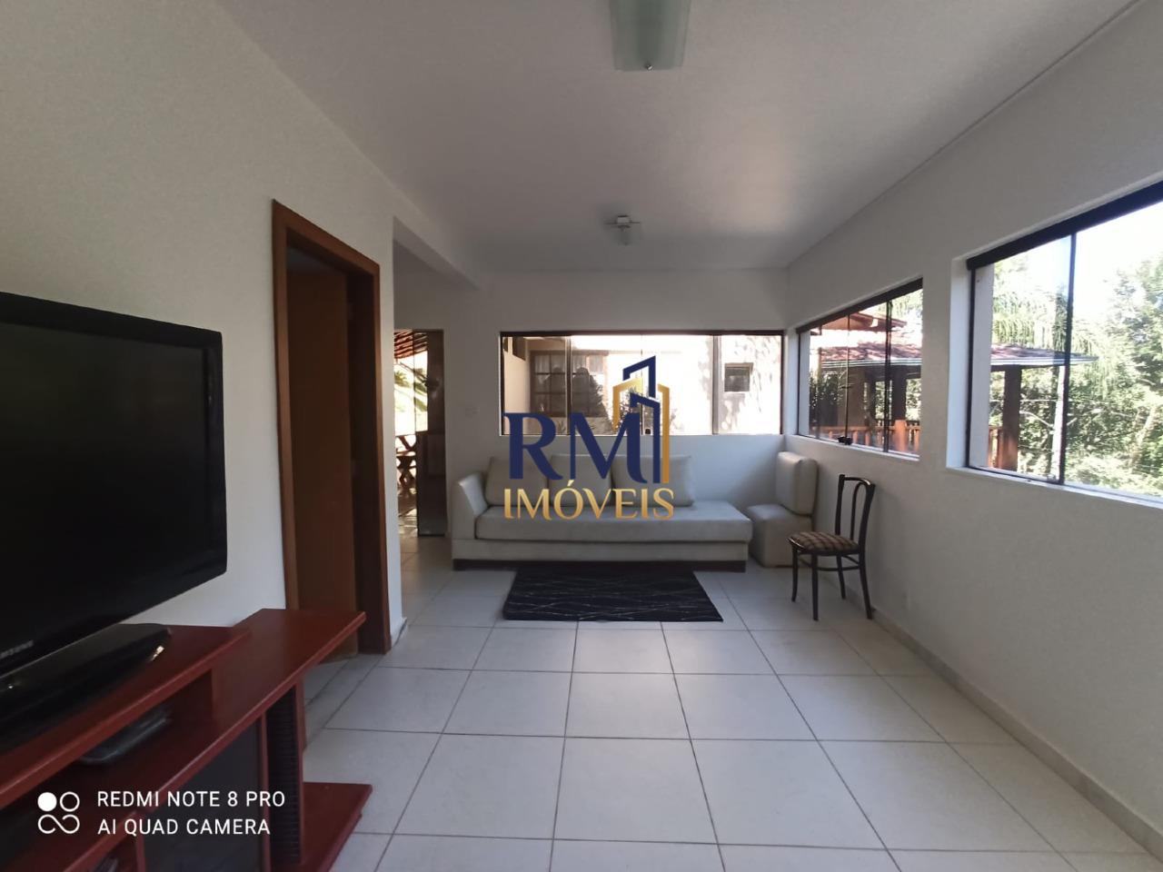 A sala de jantar tem lareira. Uma ótima varanda, com vista incrível de verde da natureza.